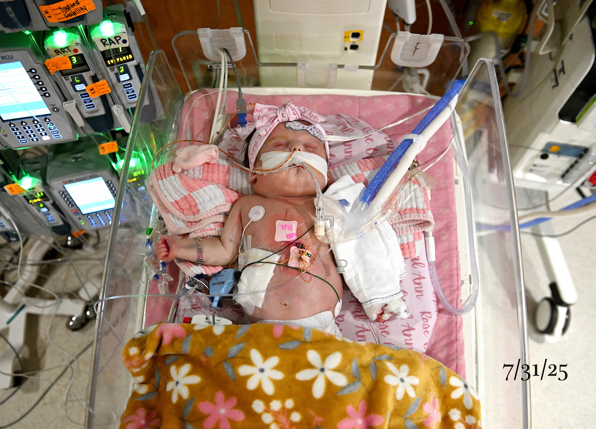 Rose was diagnosed with a rare heart defect in utero called truncus arteriosus, where a single blood vessel leaves the heart instead of two. She underwent open-heart surgery at just 11 days old, with Dr. Mark Turrentine repairing the problem.