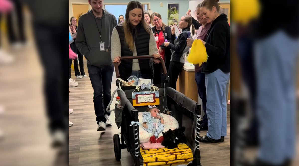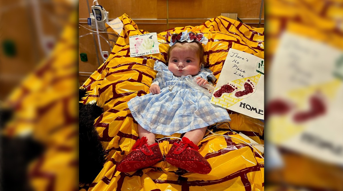 After 165 days in the hospital, baby Rose, dressed like a tiny Dorothy from “The Wizard of Oz,” follows the yellow brick road home.